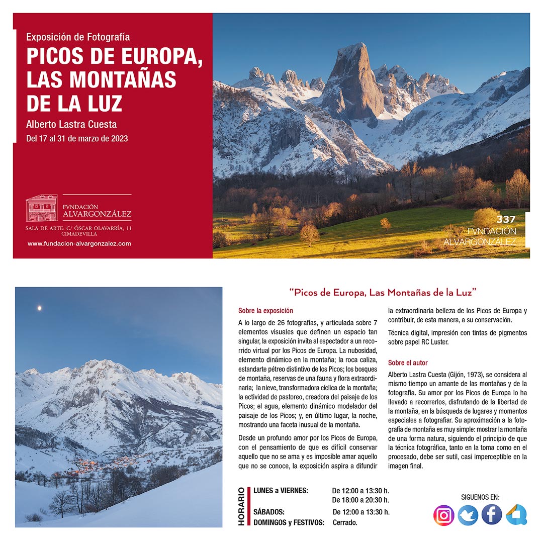 Después de su exhibición en Cangas de Onís y Avilés en 2022, la exposición Picos de Europa, Las Montañas de la luz llega a Gijón. Entre los días 17 y 31 de marzo (*), tengo el placer de exponer la muestra en la Sala de Exposiciones de la Fundación Alvargonzález, situada en la calle Óscar Olavarría, 11 Bajo, 33201 Cimadevilla, Gijón.